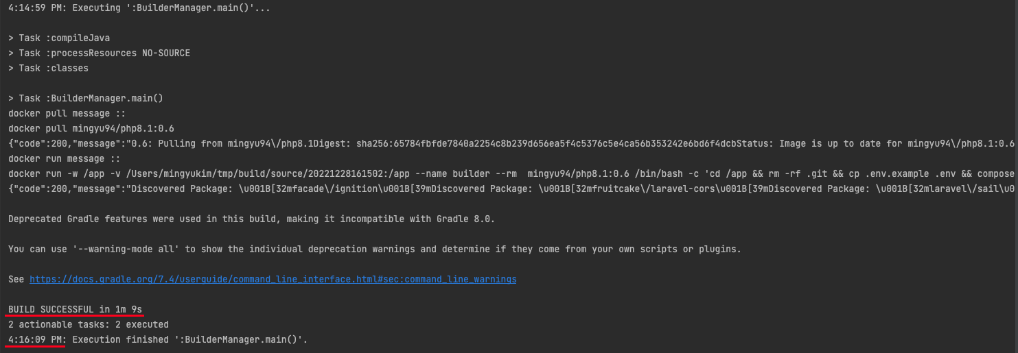 이제 main method를 실행해주면 이전 포스팅에서 구현한 GitManager에서 다운받은 최신 소스를 DockerManager에서 원하는 Image로 Build작업을 끝마친 아래와 같은 결과물을 얻을 수 있다.